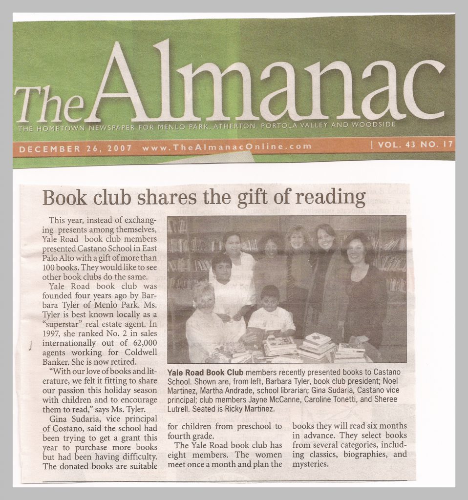 Yale Road Book Club was founded four years ago by Barbara Tyler of Menlo Park. Ms. Tyler is best know locally as “superstar” real estate agent. In 1997, ranked No. 2 in sales internationally out of 62,000 agents working for Coldwell Banker. She is now retired.